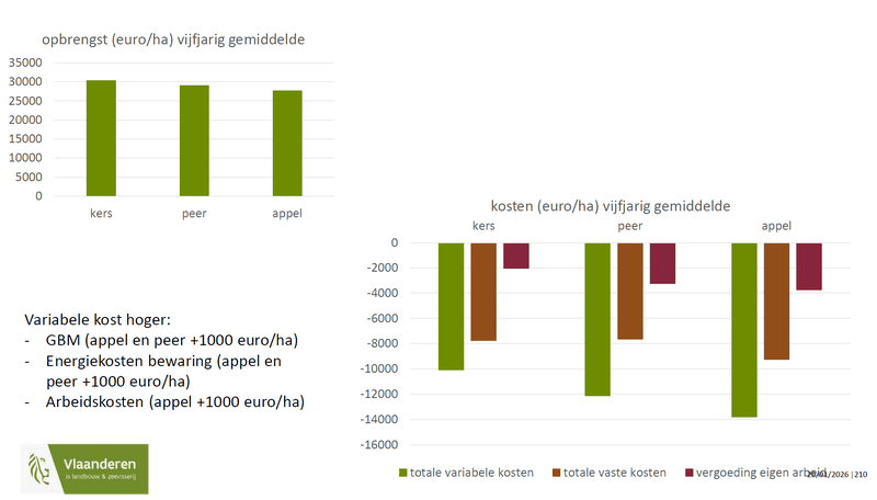Uit de analyse blijkt een netto-bedrijfsresultaat van 10.000 euro per hectare. Appels en peren scoren minder goed, met respectievelijk 800 en 5.000 euro. Een belangrijke overweging hierbij is dat de steekproef in deze studie te klein is om kritische succesfactoren te kunnen bepalen. Daarom zijn kandidaten voor het Landbouwmonitoringsnetwerk nog altijd welkom via www.vlaanderen.be/landbouw/boekhouding.