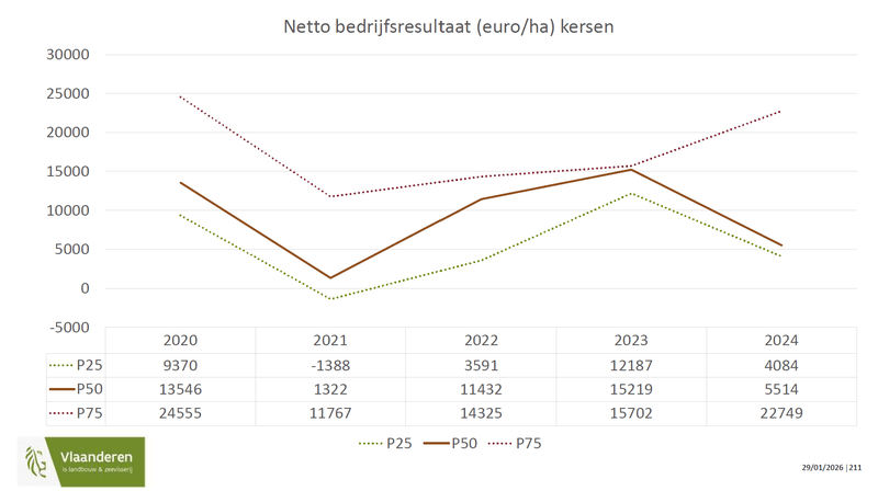 Tijdens de Nationale Studiedag Kersen werden de bedrijfseconomische cijfers van de kersenteelt onder de loep genomen. Er werd daarvoor gekeken naar bedrijven die deelnemen aan het Landbouwmonitoringsnetwerk (LMN). De steekproef is met 10 à 12 bedrijven niet groot, maar zou toch een indicatie moeten geven van de mogelijkheden in de kersenteelt.